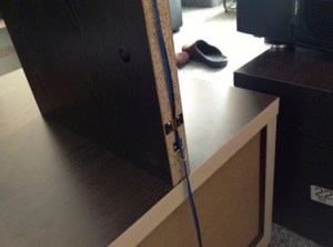 Only on the bottom the grommet wasn’t enough to keep the cable behind the wood. It just had to much twist to it. In this case I used one grommit, removed the part where the cable goes through, opened it up and nailed it to the board. That was strong enough to contain the cable.