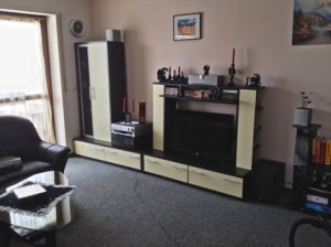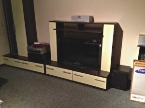Next is the rearranged version with the TV, the empty PC case and the hi-fi amp installed. Also in the picture you can see the subwoofer, center speaker and the front right speaker. The left speaker is on top of the cupboard on the left (where else?). No cables are connecting the individual parts yet. This is only to get a feeling for how it looks.