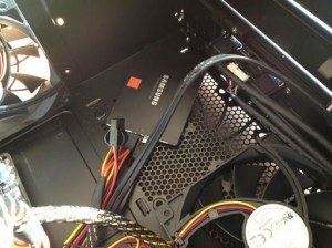 The now vacant spot on the bottom of the case was then used to fixate the SSD drive. Unfortunately I completely forgot to order a frame to mount 2.5“ into 3.5“ slots. As the drive doesn’t have any mechanical parts it doesn’t matter whether it is safely mounted or just somewhere so it is not loose. The drive has screw holes on the bottom as well so I could use the fan grill as mounting holes. Here’s the result.