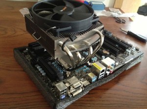 There are two things I did differently. First, I didn’t use the shims to get more pressure on the CPU. The manual says they improve pressure which in turn is supposed to improve the ability to dissipate the heat from the CPU. The manual also mentions that on LGA 1155 sockets they are not recommended as they may put too much pressure on the mainboard and eventually damage it. Allright, no shims then. Second, I applied the thermal compound on the cooler’s surface instead of the CPU. The cooler itself is not 100% plain so I thought it is best to apply as much thermal compound until the surface is „plain“ with grease. Not „thick plain“ which would drown the CPU in thermal grease but only enough to fill the gaps and have a very thin layer above it.