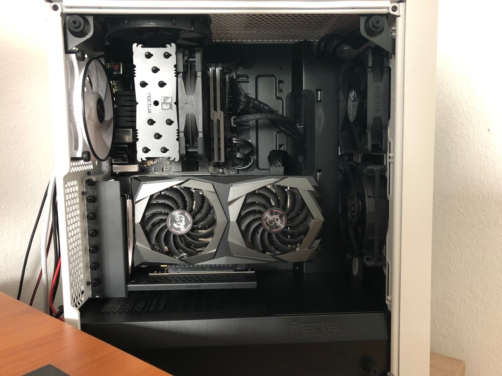 I think I can keep this section short. Since the Fractal Design Meshify C is a mid-sized tower, there are almost no limits to hardware compatibility. As you can see, I even mounted the graphics card on a vertical bracket from Cablemod. That is how much space there is, especially for the mid-range components I installed.