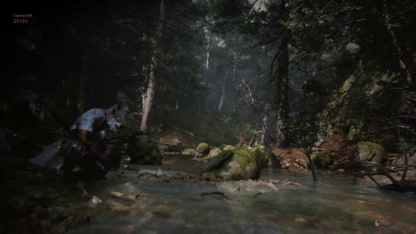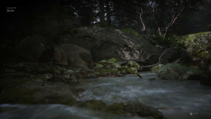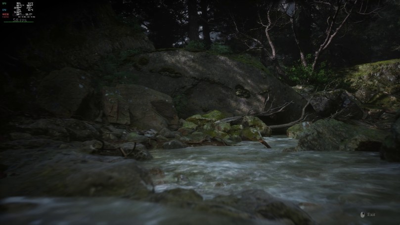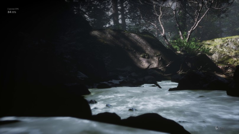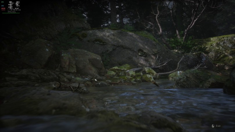 It should be evident that these are very different images. It was so different, in fact, that I considered it might be rendering at the Low quality preset, which could explain the higher performance. So, here is the same location at Low Global Illumination quality.