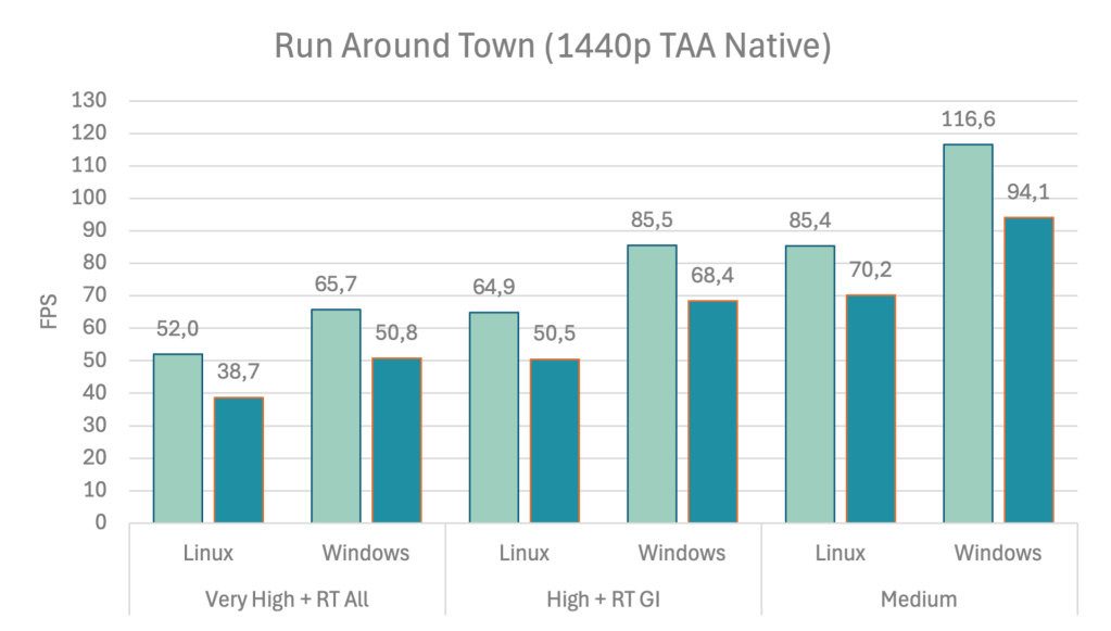 In my first tests, Windows led Linux between 10% on the Very High and 19% on the Medium preset. I’d consider this typical Unreal Engine 5 scaling behavior. But that doesn’t matter a bit since it just ran Bad and Ass.