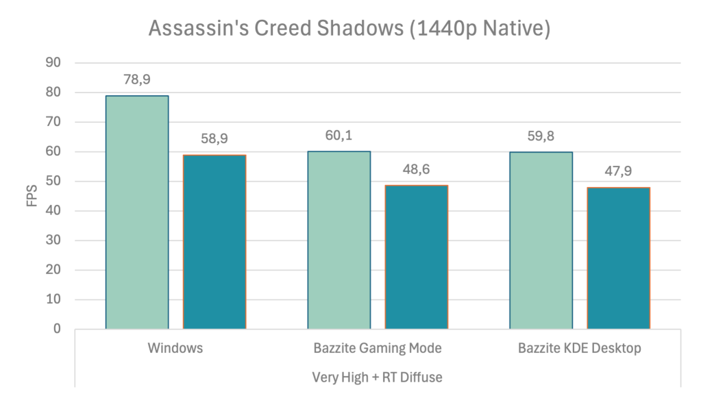 To be honest, I’m a bit surprised by the results. I have not performed a direct comparison with Windows before this benchmark – only a brief sanity check. But what we see here was consistent across several tests. Windows is the dominant leader. I suppose the leather joke from earlier better fits this title than AC Shadows.
