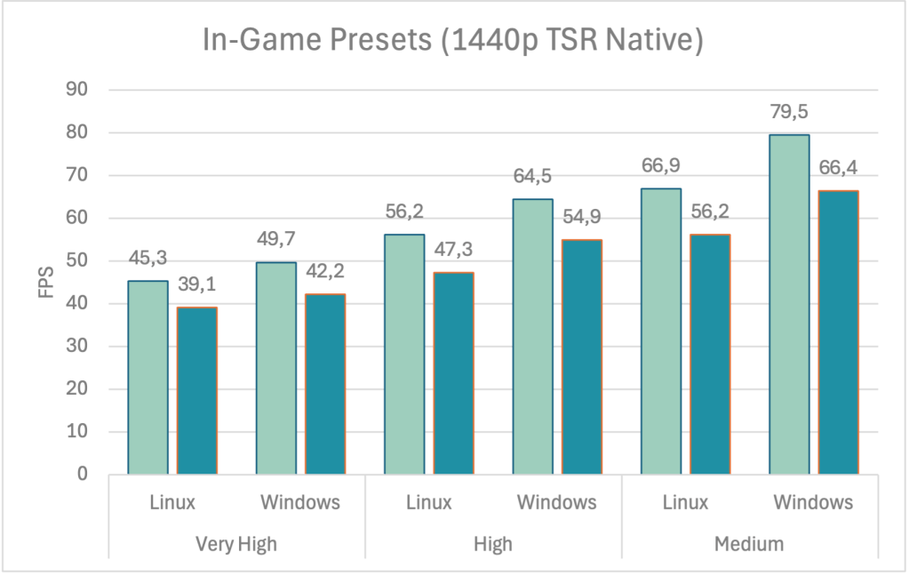 What I also noticed in many of my tests was how Windows runs away from Linux when the GPU is no longer the bottleneck. This often happens when you enable the Medium or Low presets. I think that’s when you feel the effect of the Proton translation layer taking its toll. But when the GPU is under full load with all effects enabled and a high resolution, the CPU usually has enough cycles left to work around this limitation.