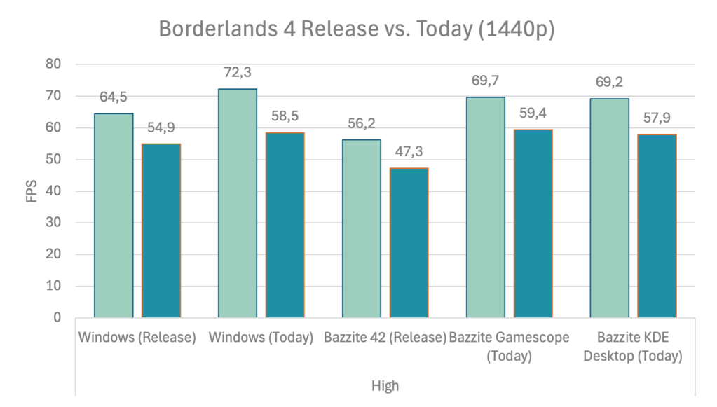 When we compare the results from launch with today, we can see two things. Gearbox did, in fact, improve the game’s horrendous performance. Maybe drivers also play a role, but we gamers don’t care. Linux and Windows are basically on par now.