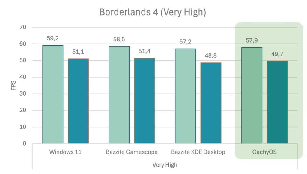 Borderlands 4 performance on Bazzite was already very close to Windows 11, and CachyOS is right up there. On average, it’s one percent behind the Bazzite Gaming Mode.
