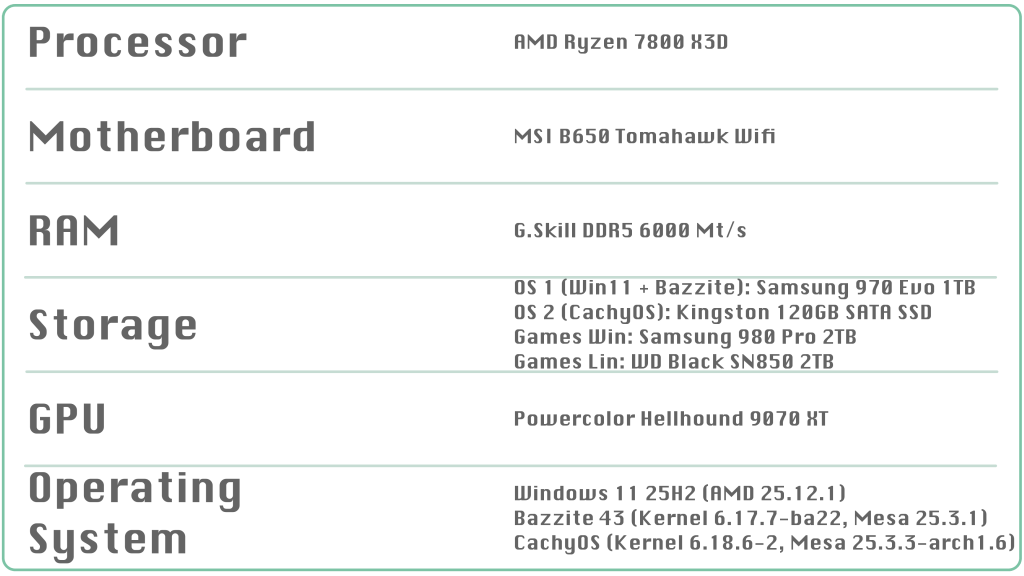 Of course, this was only a very small excerpt from the vast world of video games and my first look at CachyOS. I want to be clear that I won’t be going back to retest all games with CachyOS. That would take too much time, and I’d rather move forward to new stuff. All upcoming gameplay performance tests will use Cachy and/or Bazzite as the basis. I’ll probably decide on a whim. Maybe I can find an efficient way to explore both systems in one post, but that likely requires some experimentation on my part.