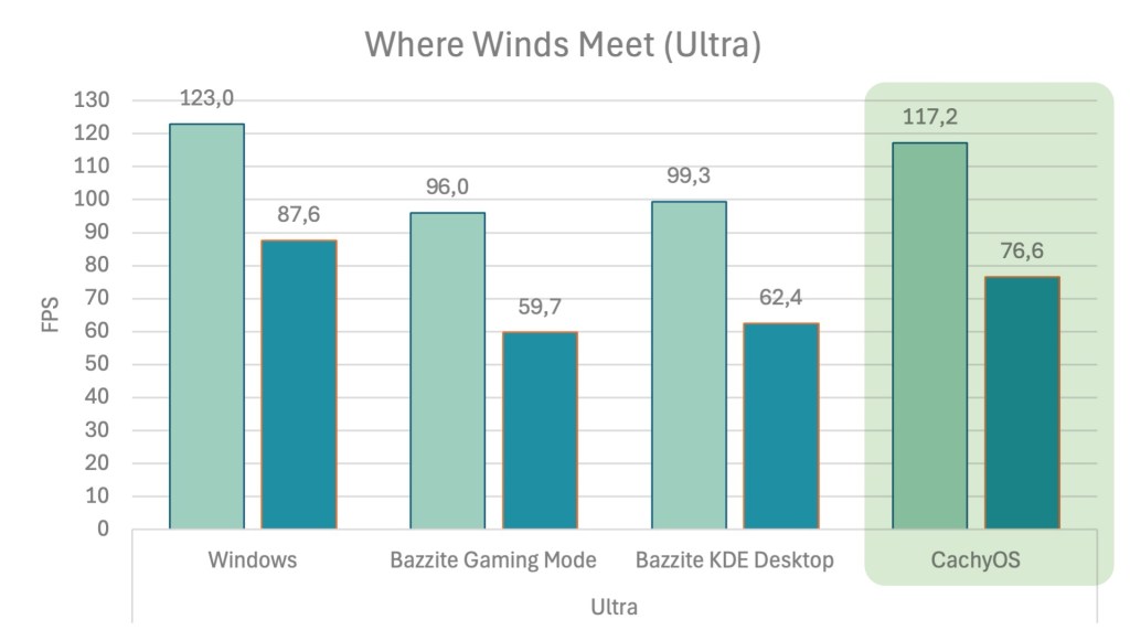 The Chinese game represents the quarter I mentioned in the intro. CachyOS does, in fact, have a tangible impact in this one. Bazzite already delivers solid, playable performance, but Cachy moves much closer to Windows 11 and trails by only 5% on average. Much more important are the 1%-lows, which improve by 23% compared to Bazzite. 60 FPS turn into around 75 FPS. That results in a much smoother gameplay experience.